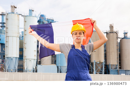 Upset disappointed young female engineer in helmet waving state flag of France during strike in front of big tanks at chemical plant