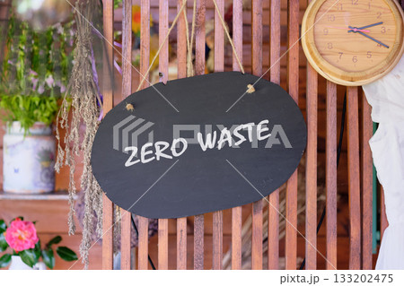 A sign that reads ZERO WASTE hangs on a wooden gate beside flowers, herbs, and a clock. It emphasizes a commitment to environmental protection and minimal trash