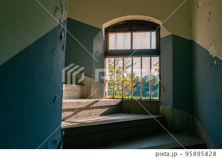 Broken window of an old house. The house is ready for demolition. Second floor, photo from below