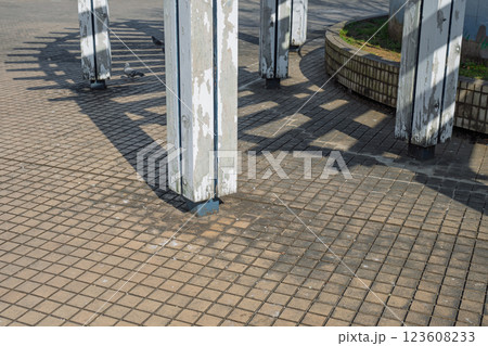 公園の老朽化したパーゴラ(日陰棚)