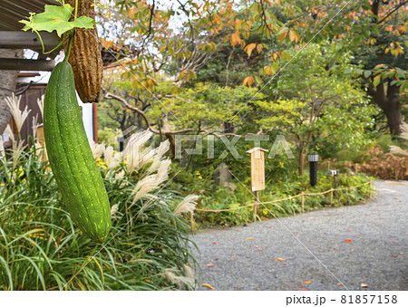 [東京・東向島] 向島百花園の内苑でパーゴラに吊ってあるヘチマのクローズアップ。