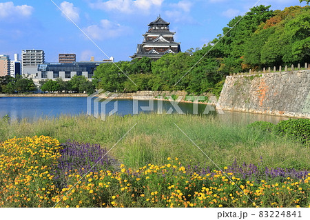 【広島県】晴天下の広島城天守閣と花畑