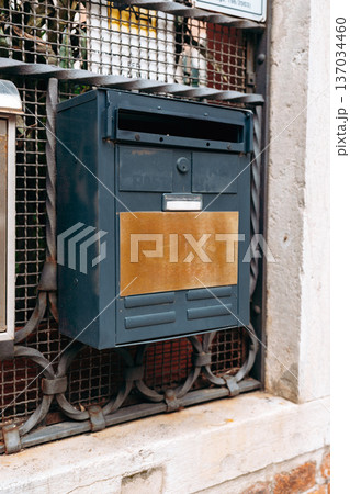 Close view of a metal curtain on a gate showing rust and wear in bright light, capturing the texture and condition of the metal