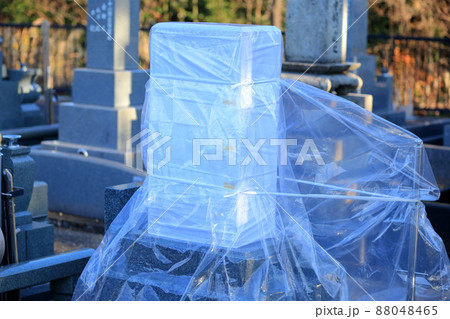 開眼法要前の白い布を掛けられた新しいお墓 墓地墓石のイメージ