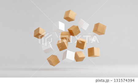 Dynamic and abstract background of wood and glass cube block shapes floating and flying in gentle motion. minimalist conceptual design showing calm and orderly cluster