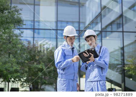 タブレットの画面を見ながら話す作業服姿の2人の男性 施工管理 イメージ
