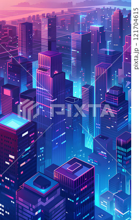 Many skyscrapers in blue colors isolated on a dark background. Bottom view. Flat style. Vector illustration.