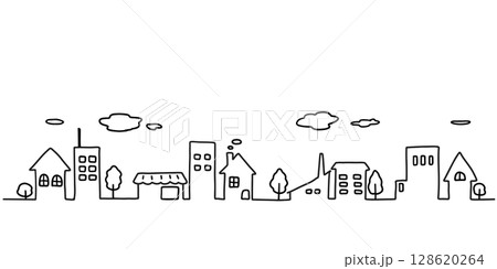 パステルカラーの街並みと車のかわいい手描きイラスト