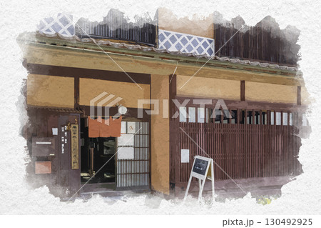 水彩画風 吹屋の町並み 長尾醤油酒店 岡山県高梁市