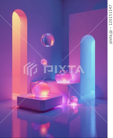 Abstract neon interior with floating bubbles for modern design concepts
