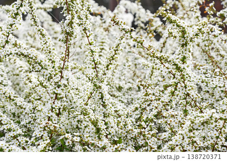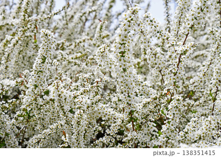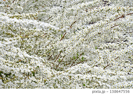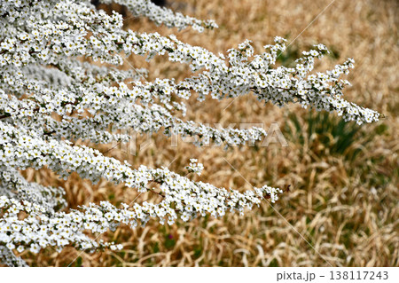 春の明るい日差しに照らされて輝く、満開のユキヤナギ