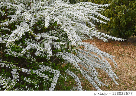 春の日差しを受けて眩しく咲き誇るユキヤナギ