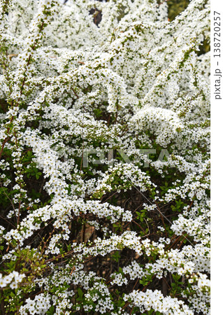 春の日差しに輝く満開の白いユキヤナギ