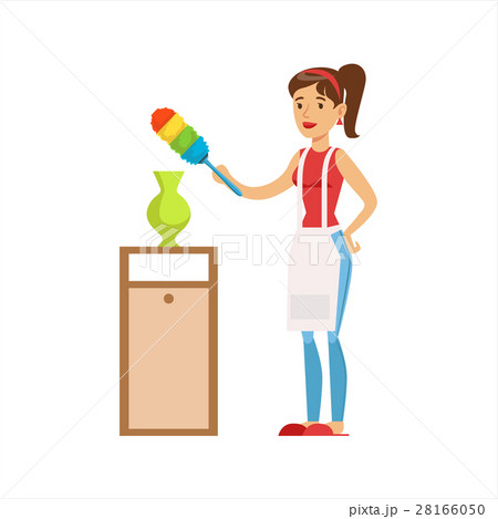 Woman Housewife Wiping The Dust Of Vase WIth Brush