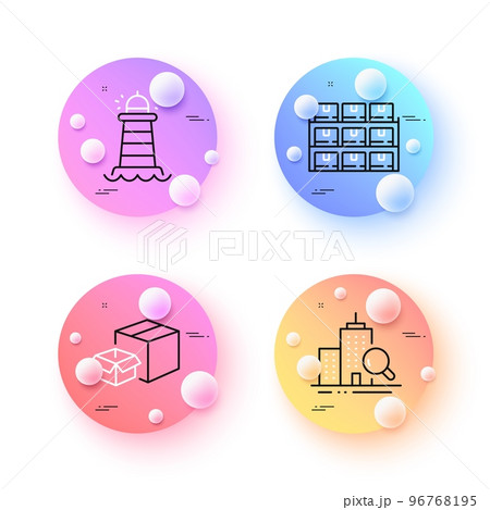 Boxes shelf, Lighthouse and Packing boxes minimal line icons. 3d spheres or balls buttons. Inspect icons. For web, application, printing. Wholesale inventory, Searchlight tower, Delivery box. Vector
