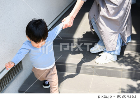 息子の手を引っ張ってダッシュする父親 会社員 慌てる 急ぐ