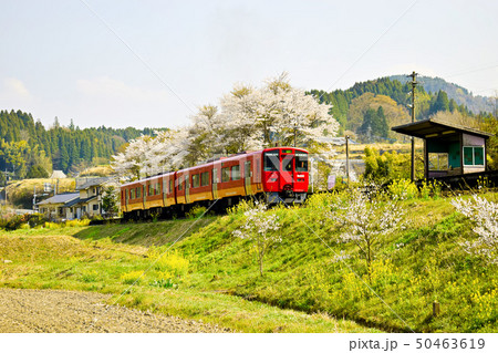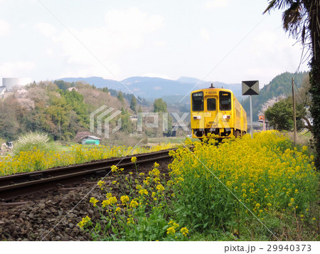 菜の花と桜と線路 引治駅 大分県九重町
