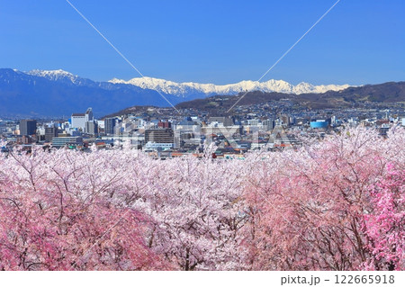 【長野県】快晴の弘法山古墳の満開の桜と北アルプス