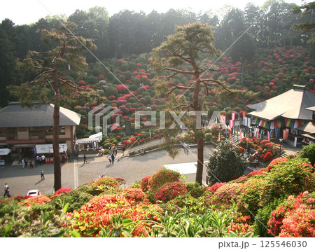 東京青梅市の塩船観音寺の鐘楼付近から護摩堂とツツジ、平和観音