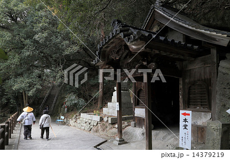 四国霊場第71番札所「弥谷寺」観音堂前を行くお遍路さん