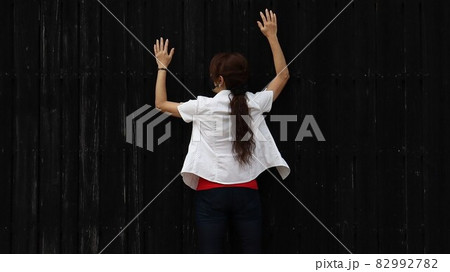 黒い壁に張り付く女性