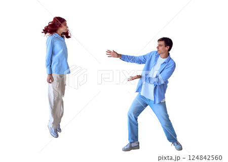 Decisive hip throw unfolding, white gi athlete launches opponent in controlled arc, embodying skill against white background.