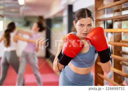 Confident Young Woman in Boxing Gloves Ready for Action with Generative AI.