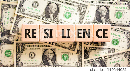 Resilience symbol. Concept word Resilience on beautiful wooden blocks. Dollar bills. Beautiful background from dollar bills. Business resilience concept. Copy space.