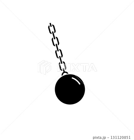 Simple black solid wrecking ball swinging from chain in motion depicting destruction