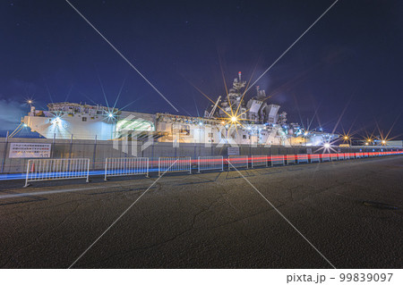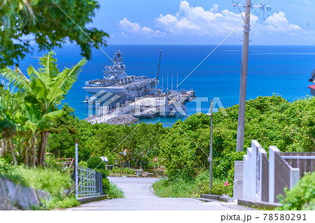 沖縄県のうるま市平敷屋で撮影した勝連半島先端にホワイトビーチ海軍基地に寄港している強襲揚陸艦アメリカ