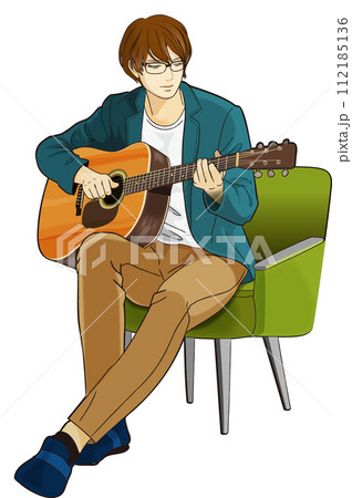 椅子に座ってアコースティックギターを弾く男性