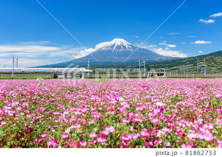 Shinkansen at pink flower and mount fuji, Shizuoka