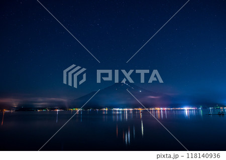 (山梨県)山中湖 富士山の人文字と天の川 湖面の映り込み