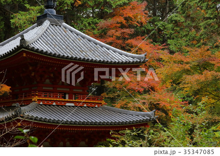 京都府木津川市・秋の浄瑠璃寺・紅葉の中の三重塔