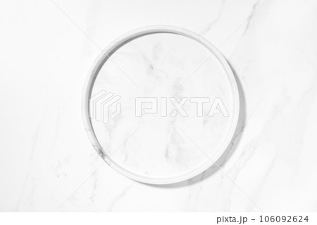 Beauty cosmetics product presentation flat lay mockup scene with white marble circle plate on white marble table with copy space.