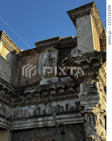 Dramatic remnants of ancient Roman architecture showcase detailed carvings and a prominent statue, set against a bright blue sky, reflecting the grandeur of historical craftsmanship.