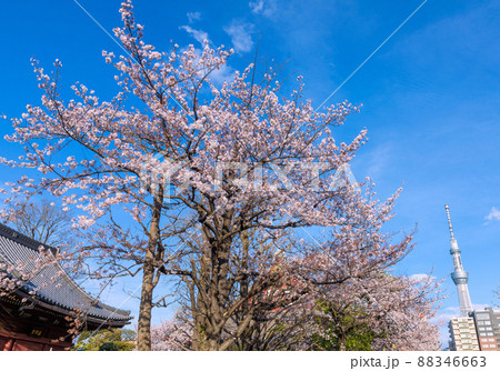 日本の東京都市景観 4月1日・春、桜の季節、浅草寺。薬師堂前から東京スカイツリーなどを望む=1日
