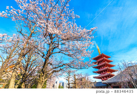 日本の東京都市景観 4月1日・春、桜の季節、浅草寺の五重塔などを望む=1日