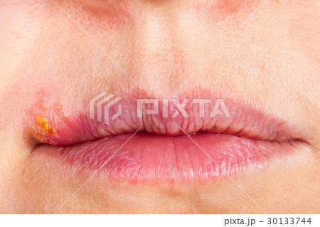 Close up of girl lips affected by herpes. Treatment of herpes infection and virus. Part of young woman face, lips with herpes affected. Beauty dermatology concept.