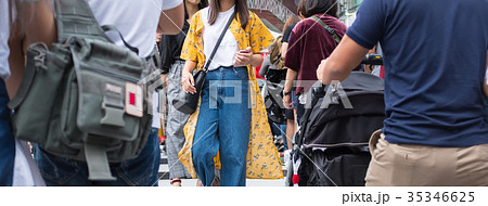 歩きながら何かを眺める幅広い世代の人々の後ろ姿の全身写真