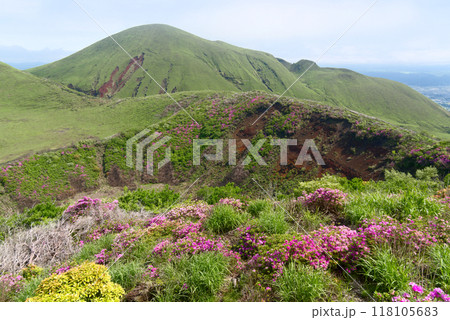 熊本県阿蘇山 ミヤマキリシマの群生地 烏帽子岳より馬の放牧が見られる草千里方向を望む