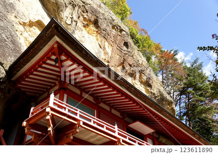 崖下の岩屋に建つ達谷窟毘沙門堂の屋根と崖上の紅葉 青空