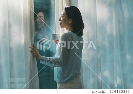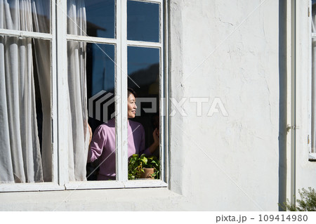 窓の外を見つめる女性