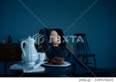 暗い部屋でくつろぐ女性