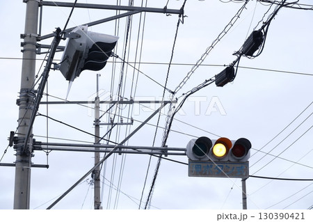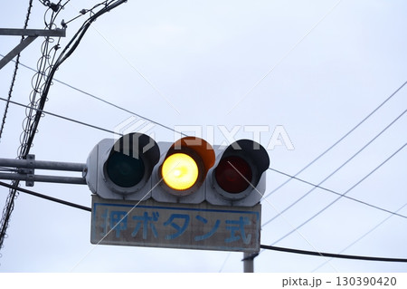 黄色点灯を示す押しボタン式信号機