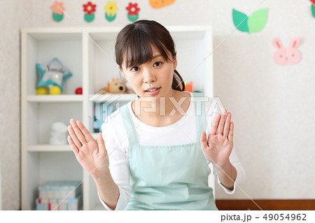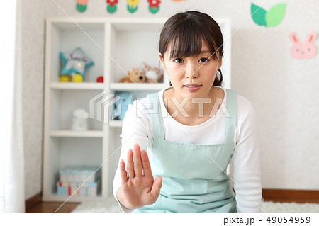 困った顔でストップのポーズをする私服の若い女性(上半身)