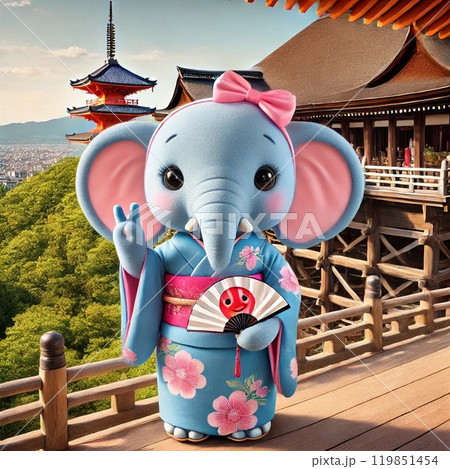 清水寺でピースをする着物を着た水色の可愛い象