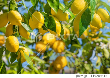 Lemon garden ready for harvest. Bunches of fresh yellow ripe lemons with green leaves.