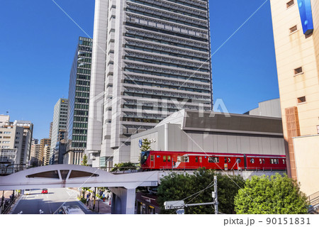 後楽園駅前の風景 高架を走る丸ノ内線の赤い車両