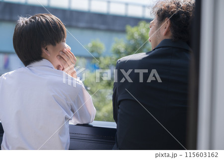 学校のベランダで進路を悩む先生に相談する中学生 高校受験や頑張る横顔の顔無しイメージ